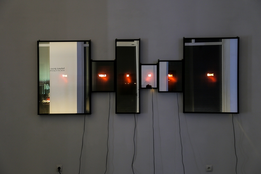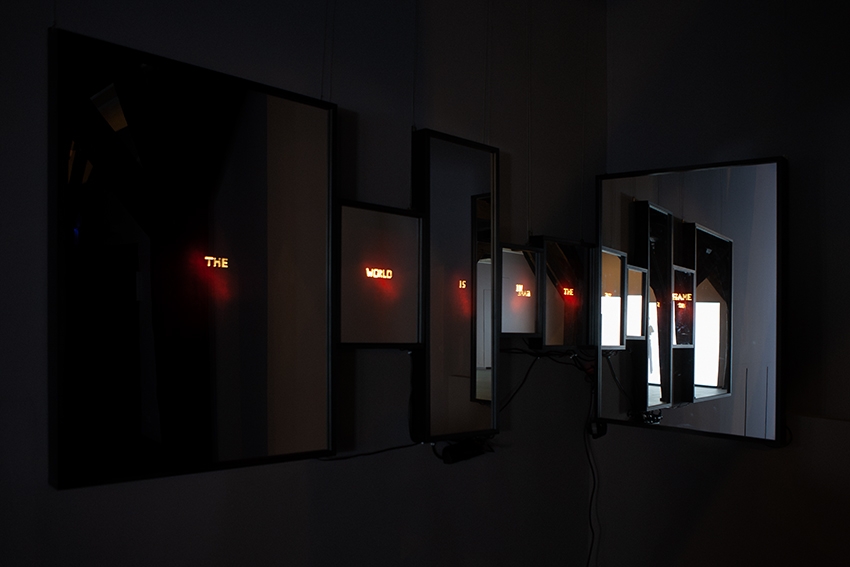 "The World is in the Game" is a series of video performances where the artist enacts movements inspired by games, yet devoid of their context. The viewer observes the performer repeating gestures imposed by the mechanics of an "invisible" game, emphasizing the tension between the body and the system. Within the exhibition space, a mirror installation accompanies the works, where viewers see themselves reflected along with the phrase "The World is in the Game," suggesting that we all play our part in the rules of the contemporary world.